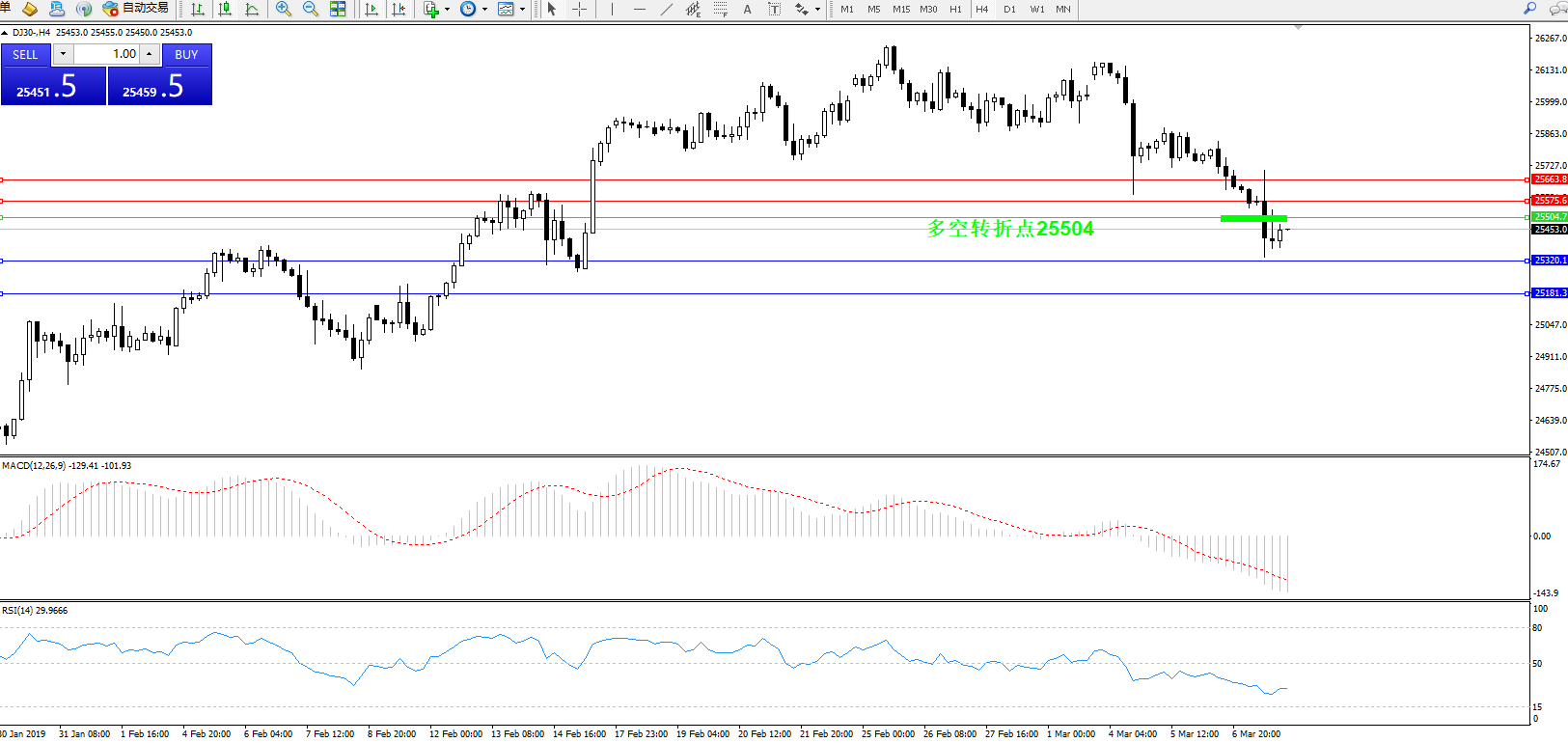 道琼斯指数DJ30—— 4小时K线图显示:
