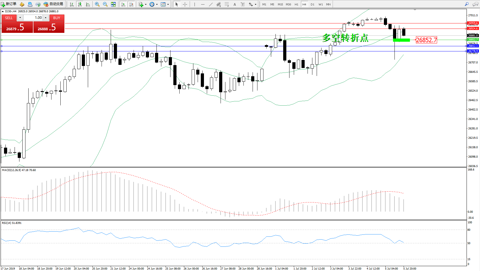 道琼斯指数DJ30—— 4小时K线图显示: