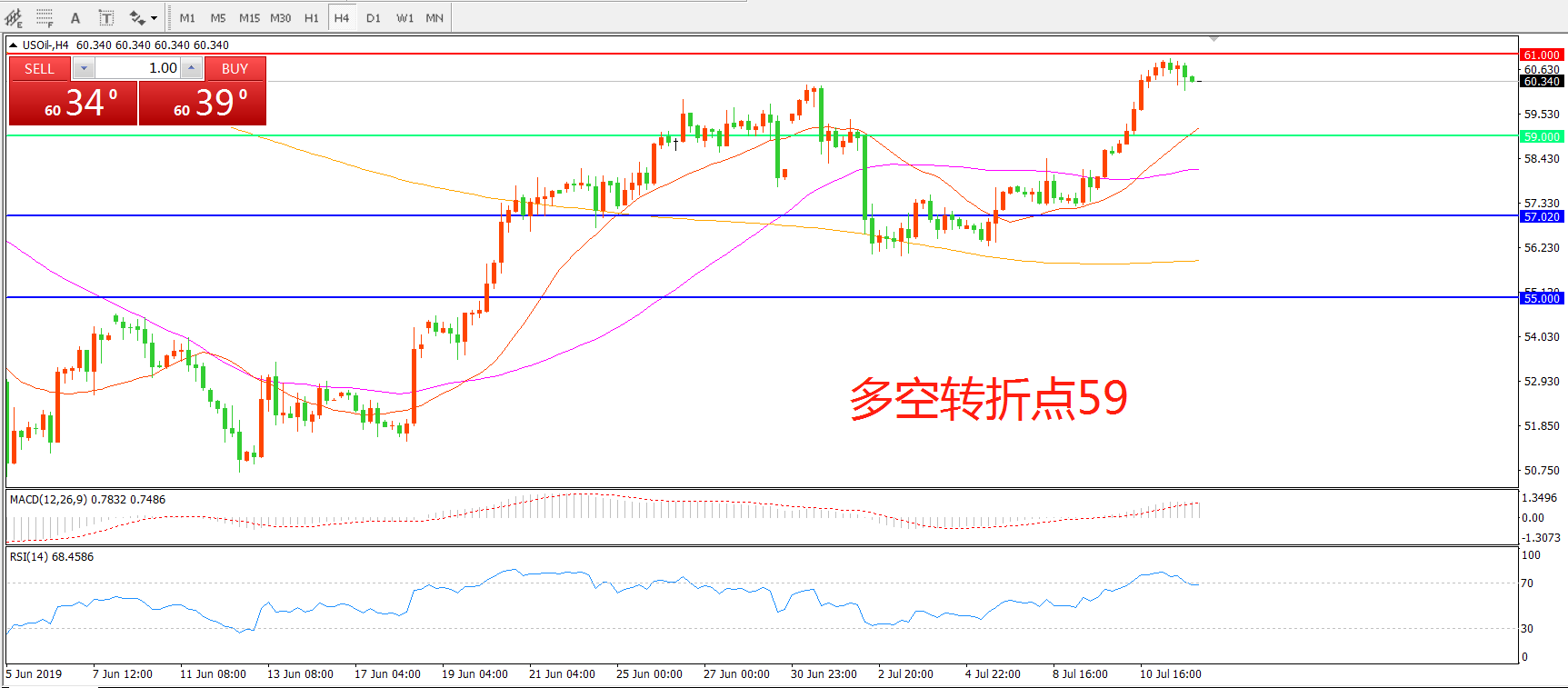 4小时图看,油价冲高至61美金附近小幅回落,显示上方阻力较强,短期均线依然上行, MACD红柱缩短, RSI指标走平,日内可能有小幅回落,但整体依然以多头思路为主。
