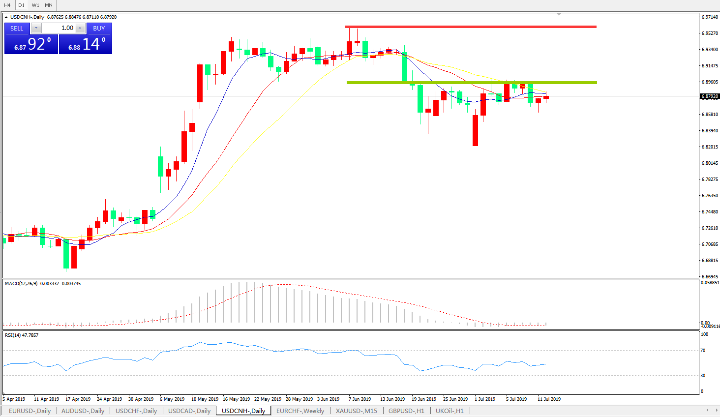 技术面简析:日线图多均线粘合无方向,MACD徘徊在0轴附近且动能柱若隐若现,RSI逐步走平,预计短期汇价将继续整理,中期关注7.0整数关口压制是否有效及中美贸易谈判最新进展。