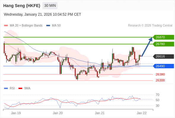 在 26490 之上,看涨,目标价位为 26780 ,然后为 26870 。