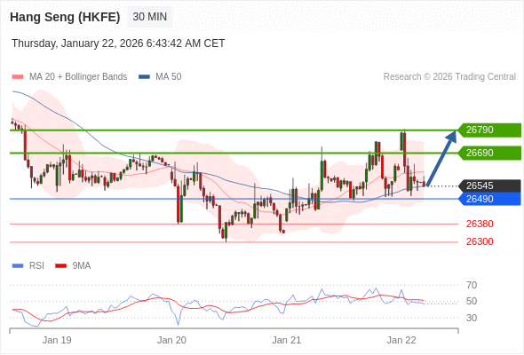香港恒生指数期货 当日内: 在26490之上,看涨。