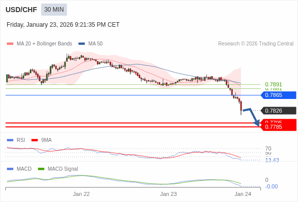 技术点评: RSI技术指标小于30。在这种情况下,说明有很强的下跌趋势,或者意味着处在超卖的状态下,可能会有向上的反弹。我们将观察RSI技术指标是否出现背离现象。 MACD技术指标处在其信号线之下看空。 配置为负。 此外,价位低于其20天及50天移动平均线 ( 分别位于0.7886 和0.7894 )。 最后,价位跌破其布林线通道下轨 (位于0.7836。