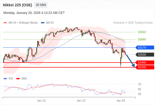 在 53170 之下,看跌,目标价位为 52450 ,然后为 52220 。