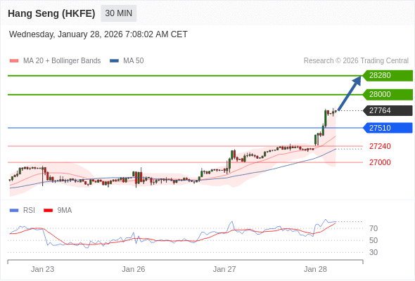 在 27510 之上,看涨,目标价位为 28000 ,然后为 28280 。