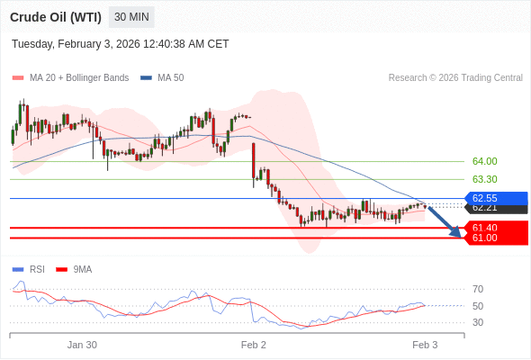 交易策略: 在 62.55 之下,看跌,目标价位为 61.40 ,然后为 61.00 。