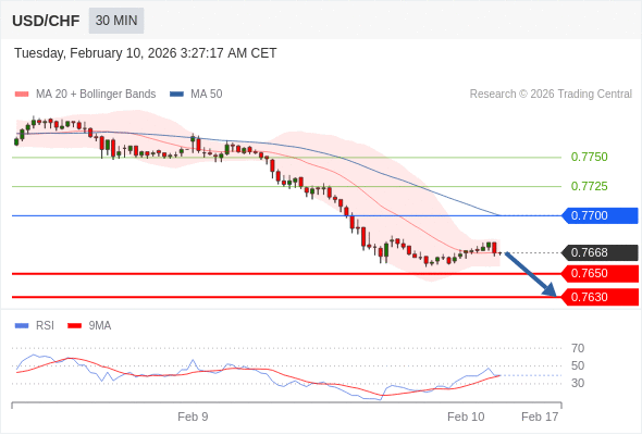 美元/瑞郎 当日内: 朝0.7650运行。