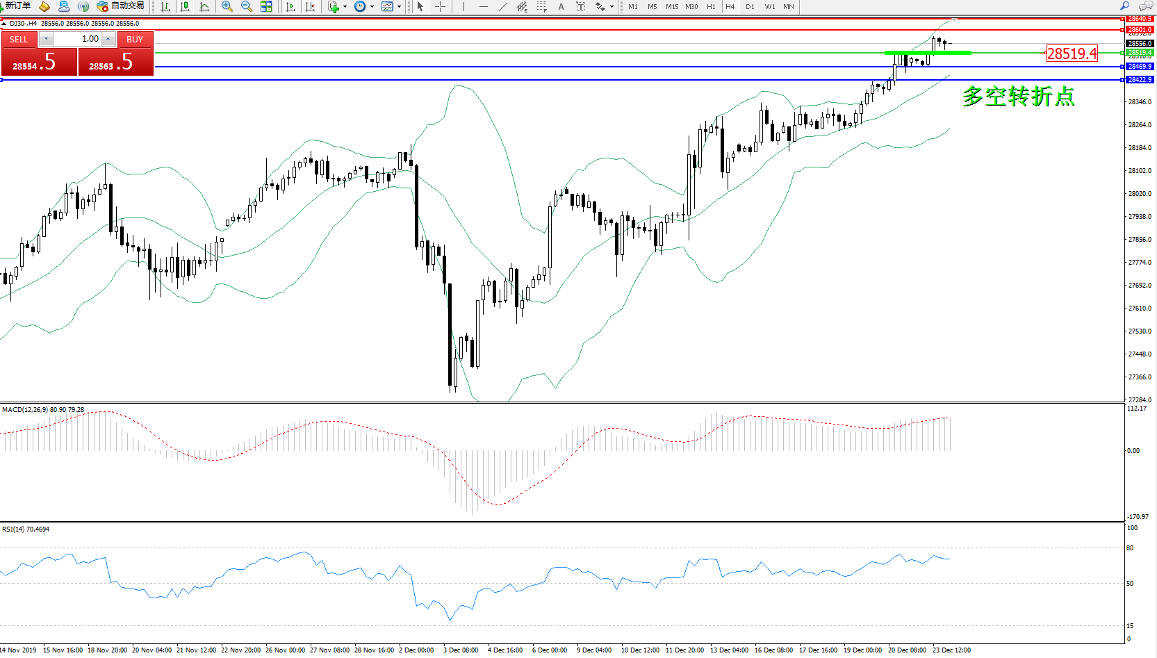道琼斯指数DJ30—— 4小时K线图显示: