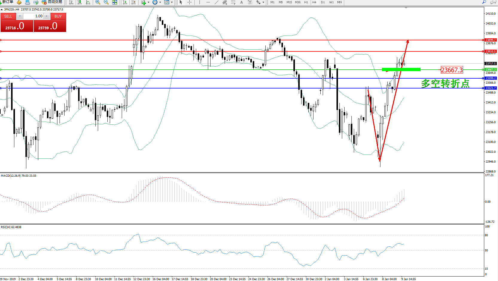 技术点评:在不断宽幅震荡下移后,低位得到强势多头动力入场,从布林带指标下轨附近直线飙升至上轨附近且未有止步迹象,布林带指标呈张口走势后又开始收口,多头动力相对强悍,MACD指标处于多头区域高位不断持续上移中,RSI指标处于多头区域高位整理平移中;
