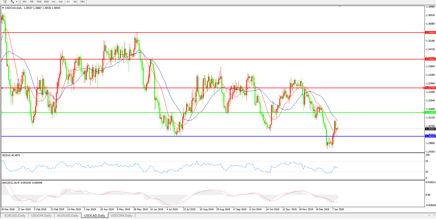 技术面简析:日线图短期均线开始快速走强,汇价快速反弹后承压下行,MACD开始走平且量能收缩,RSI震荡走升,预计汇价短期大概率将延续反弹,重点关注1.3140附近压制是否持续有效,中期下行趋势不改。