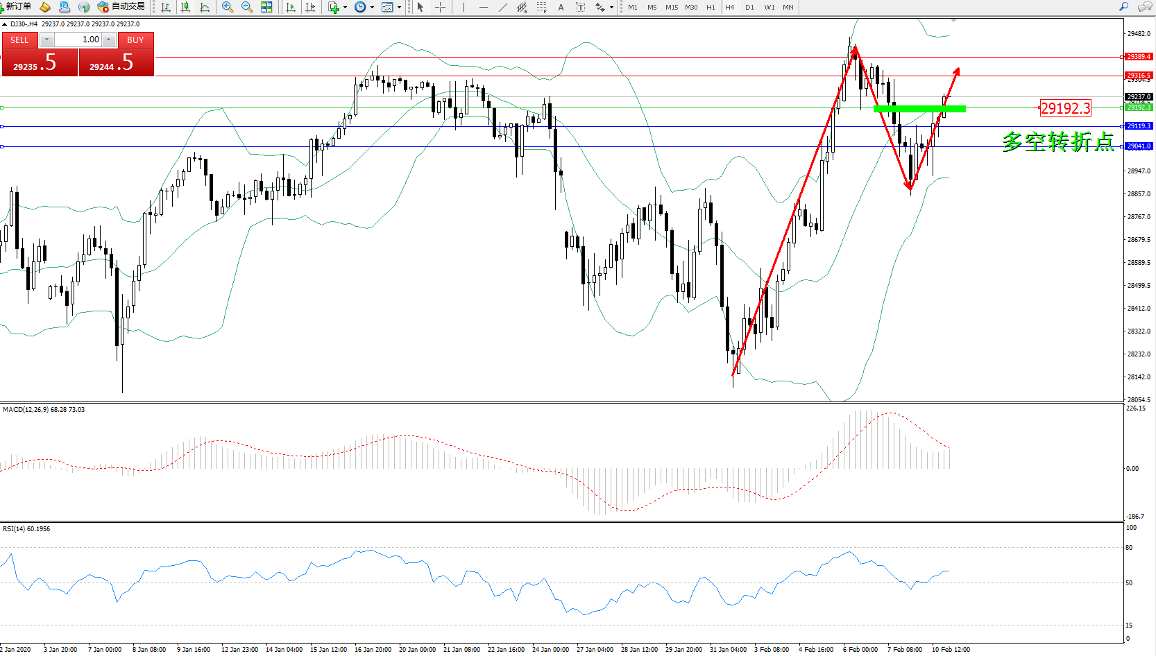 道琼斯指数DJ30—— 4小时K线图显示: