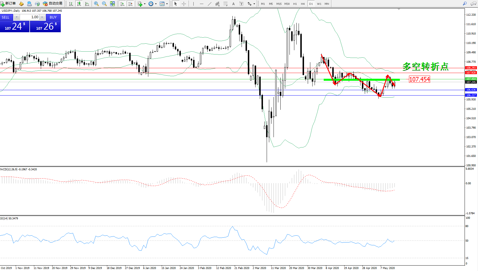 交易策略:107.454下方看跌,目标106.636106.227