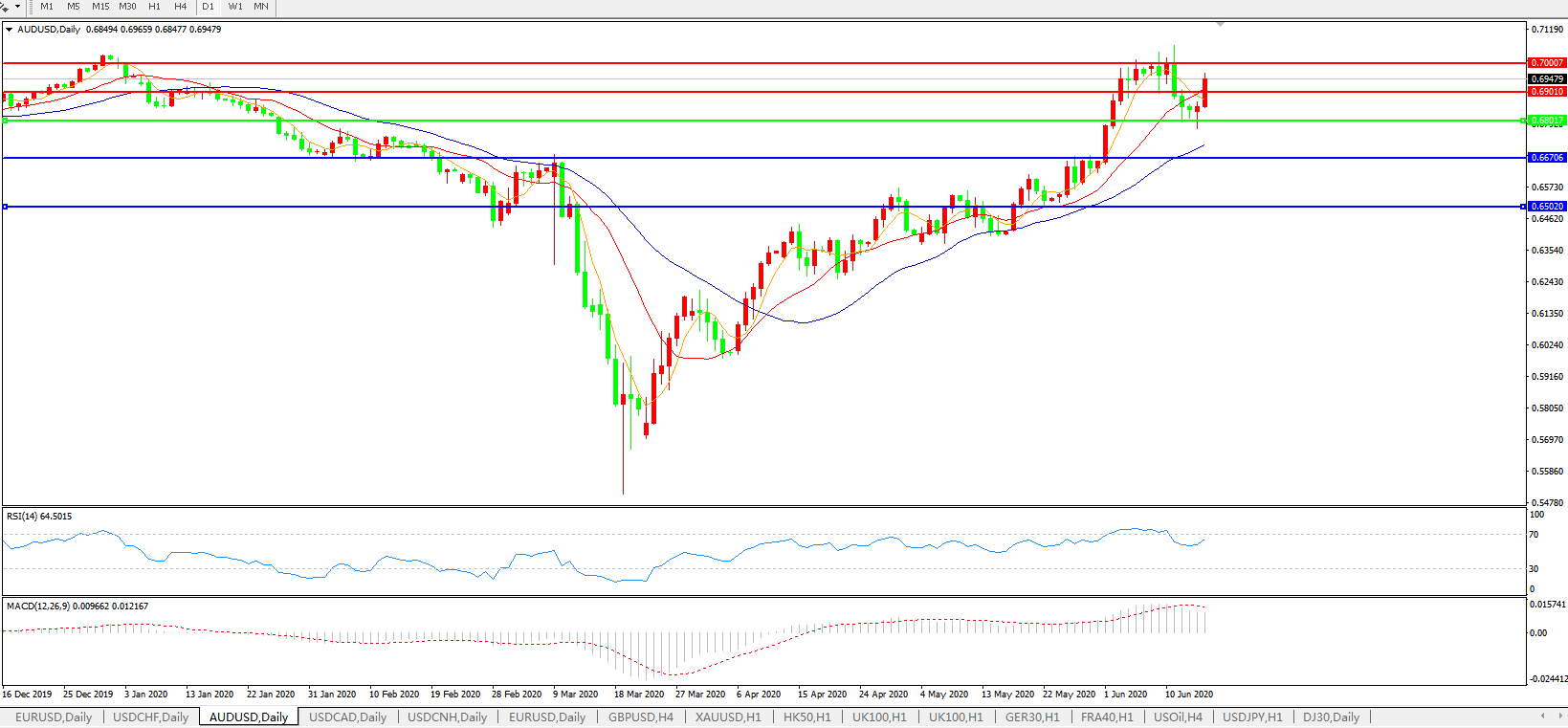 野村证券(Nomura)指出,澳元兑美元短期内存在双向风险。当地局势开始为澳元带来提振,其中包括经济重启和较低的确诊比例,铁矿石价格走高,以及对失业率已经触顶的预期等(预计会从10%下降至8%)。不过虽然美国疫情存在二次爆发的风险,但还没有得到充分的证明,因此我们有点转向风险模式,这将有助于澳元表现。我们的感觉是澳元应该会回升,因此我们需要在短期内注意澳元的双向风险,已经不会仅仅从空头方向来操作澳元。