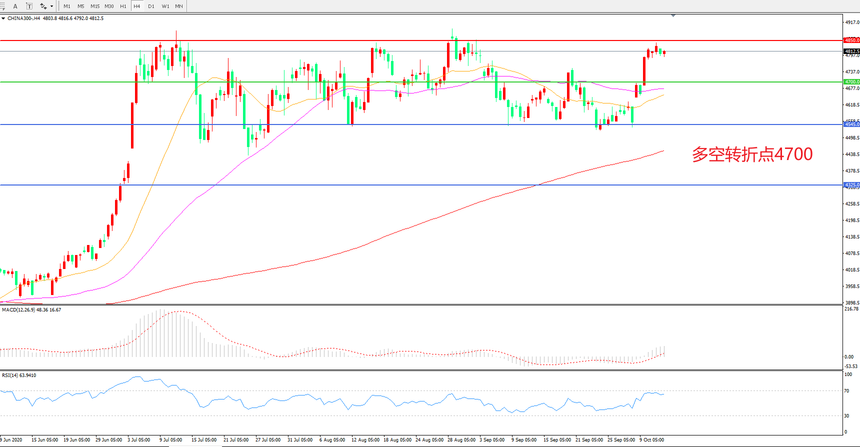 4小时图看,沪深300延续震荡上行,短期走势依然偏强,4850成为上方短期阻力,均线系统走平, MACD红柱增加,RSI指标向上,日内延续上行概率较大。