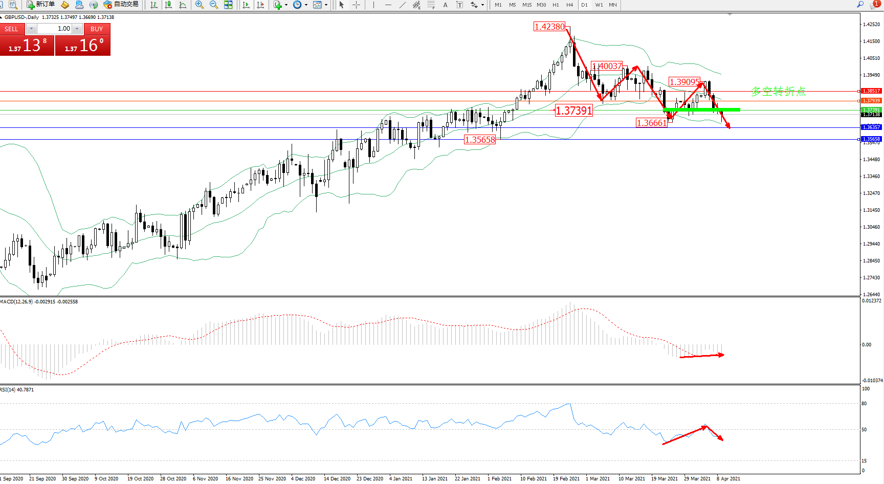 交易策略:1.37391下方看跌,目标1.36357、1.35658