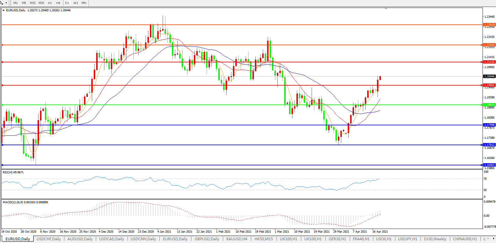 技术面简析:日图均线呈多头头排列,汇价快速上行击穿1.20关口,MACD上穿0轴且量能有小幅放量迹象,RSI持续走升,预计短期汇价大概率进一步上行。