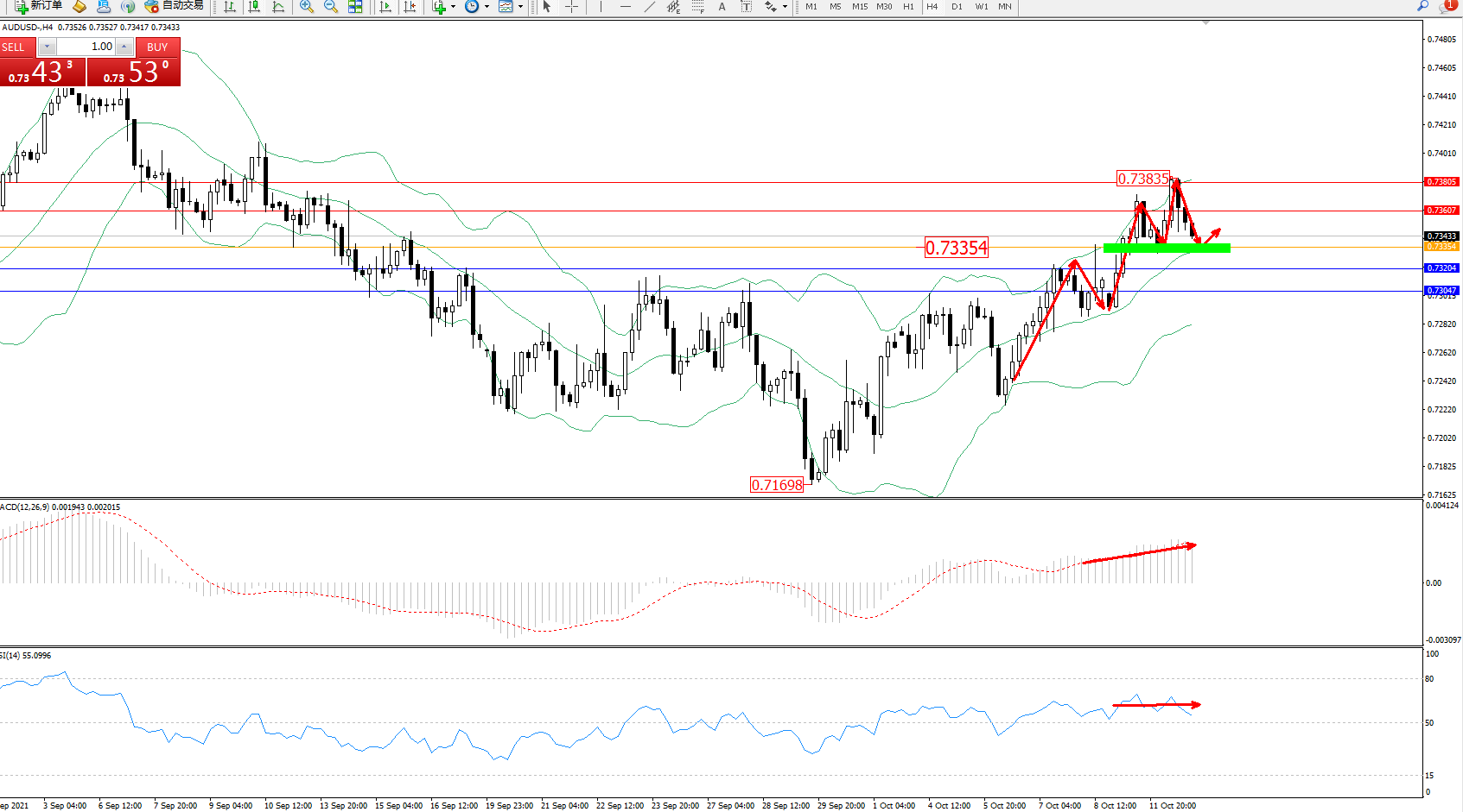 交易策略:0.73354上方看涨,目标0.73607、0.73805