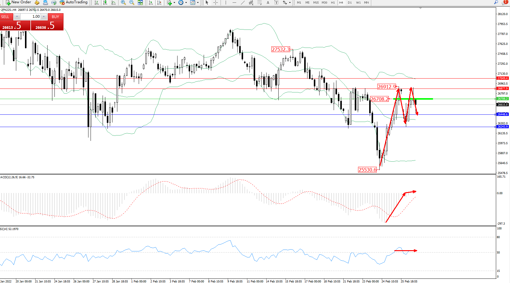 交易策略:26708下方看跌,目标26448、26243