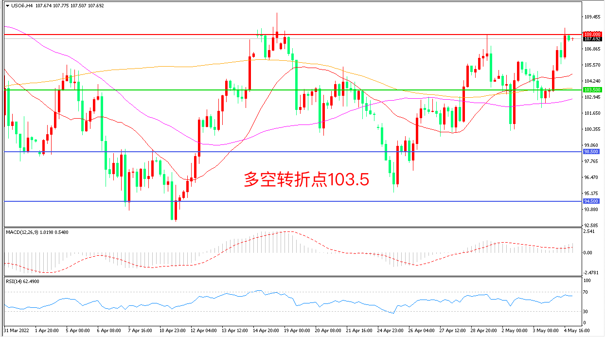 4小时图看,油价长阳拉升,短期走势偏强,21周期均线成为下方支撑,MACD红柱增加,RSI指标走平,日内延续震荡概率较大。