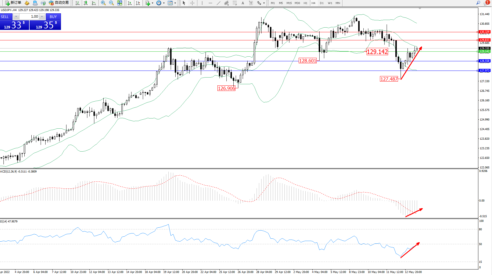 交易策略:129.142上方看涨,目标129.833、130.329