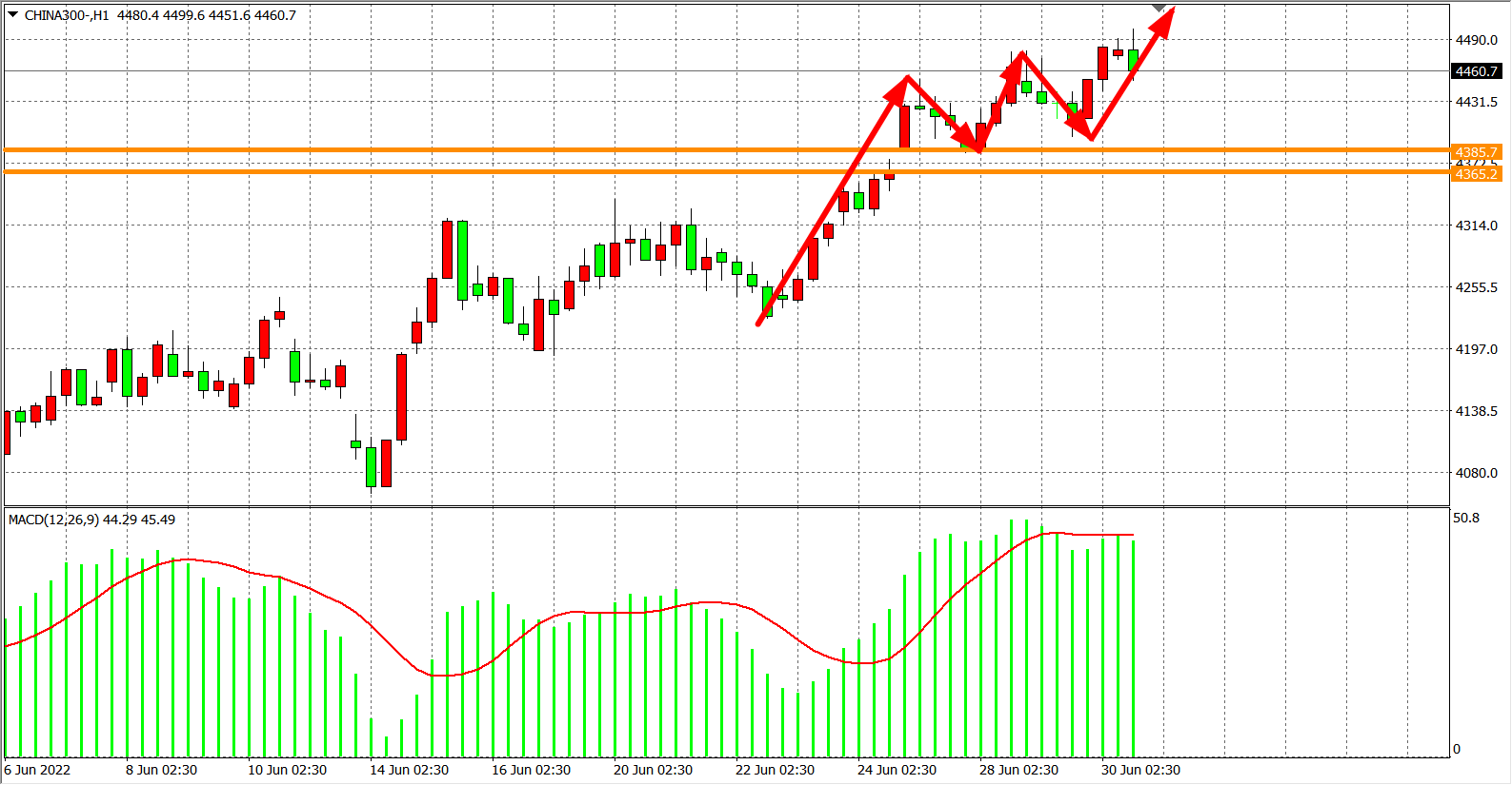 1小时图看,沪深300继续走强破昨日高点,在强支撑4365之上行情处于上涨阶段,MACD于零轴之上重新放量,短期内仍旧是多头偏强,目前支撑已上移至4385,日内在4385之上可维持看涨4500-4600