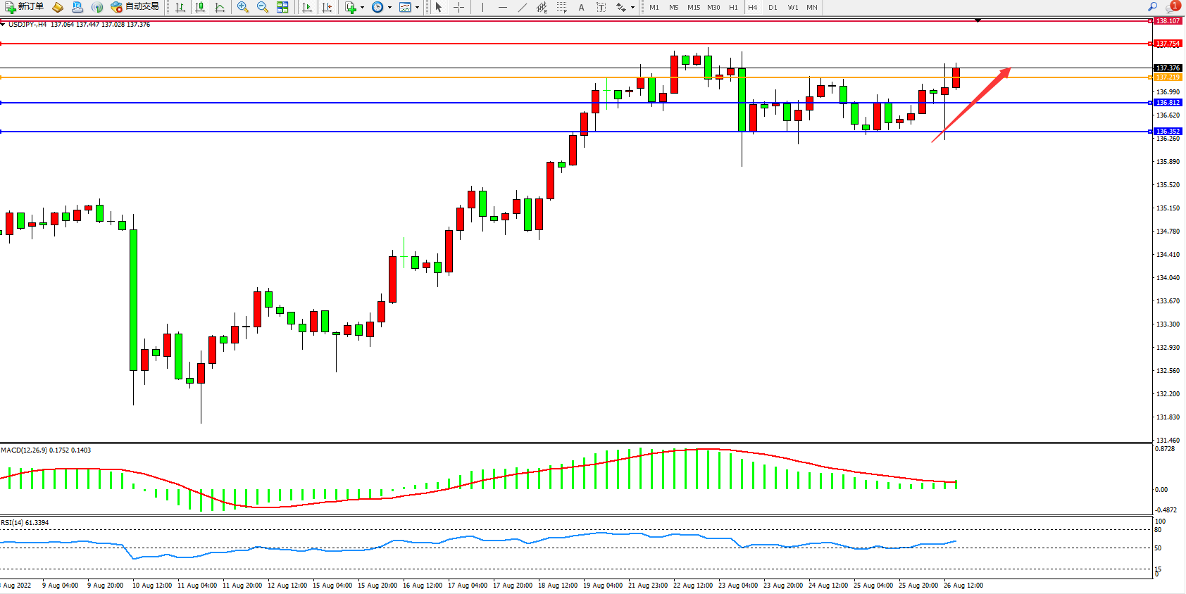 交易策略:137.219下方看跌,目标136.812、136.352