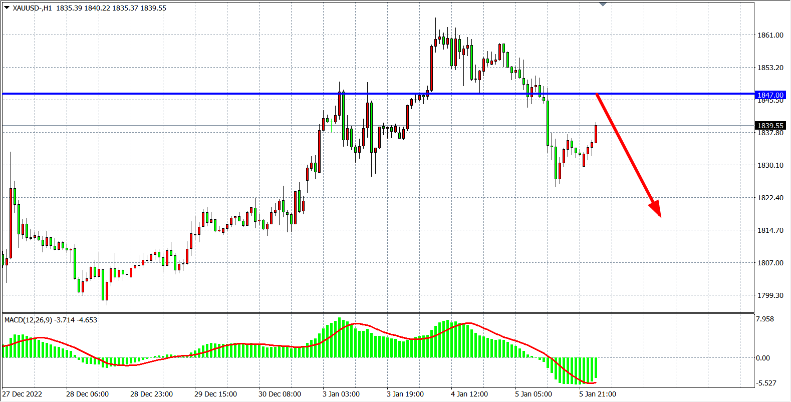 交易策略:在1847.00 之下看跌,目标1825.00         1810.00