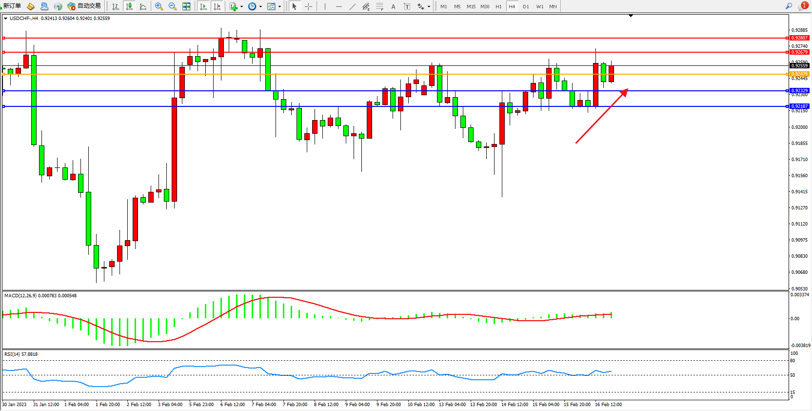 美元瑞郎USDCHF——4小时K线图显示: