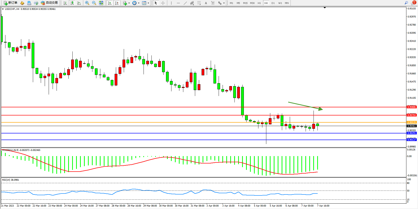 美元瑞郎USDCHF——4小时K线图显示: