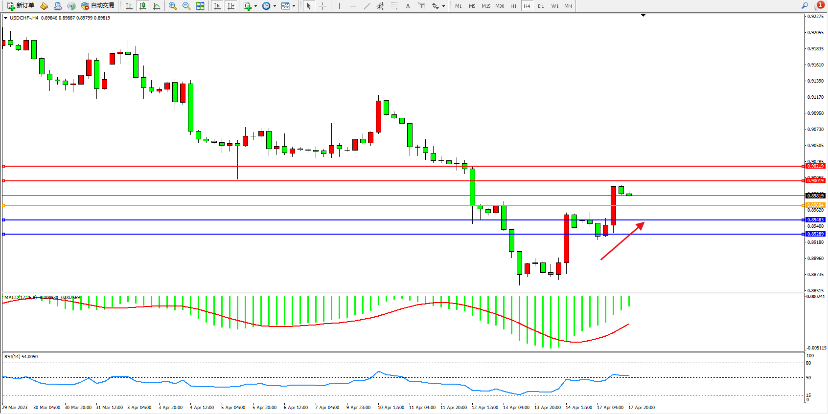 美元瑞郎USDCHF——4小时K线图显示: