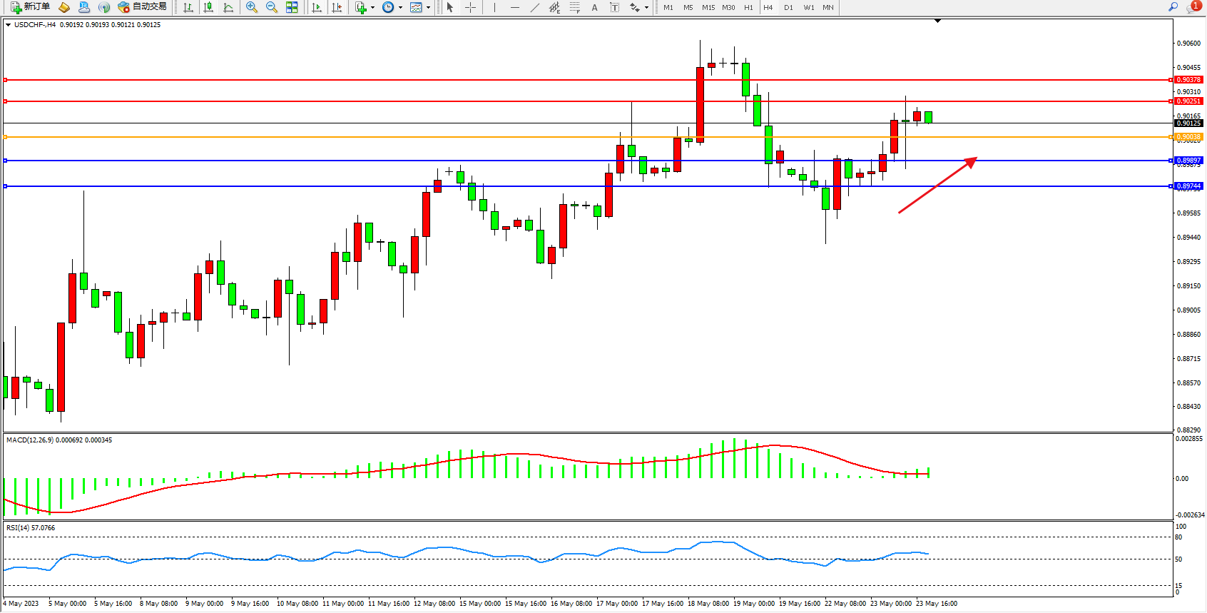 美元瑞郎USDCHF——4小时K线图显示: