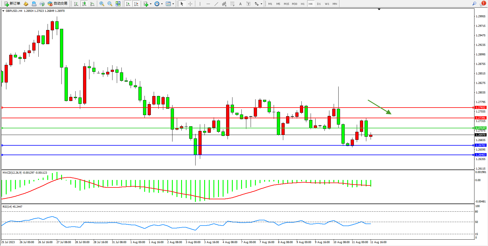 交易策略:1.27137下方看跌,目标1.26702  1.26463