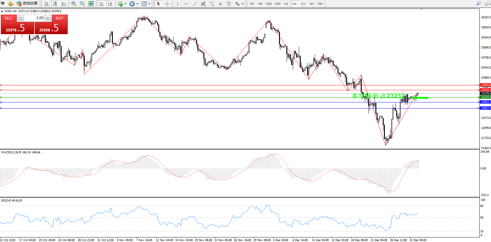 道琼斯指数DJ30—— 4小时K线图显示: