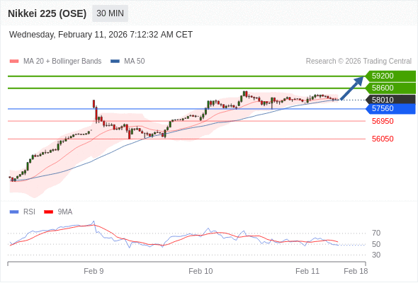 在 57560 之上,看涨,目标价位为 58600 ,然后为 59200 。