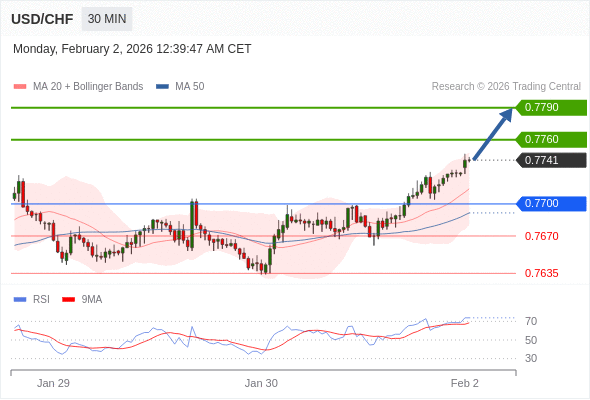 在 0.7700 之上,看涨,目标价位为 0.7760 ,然后为 0.7790 。