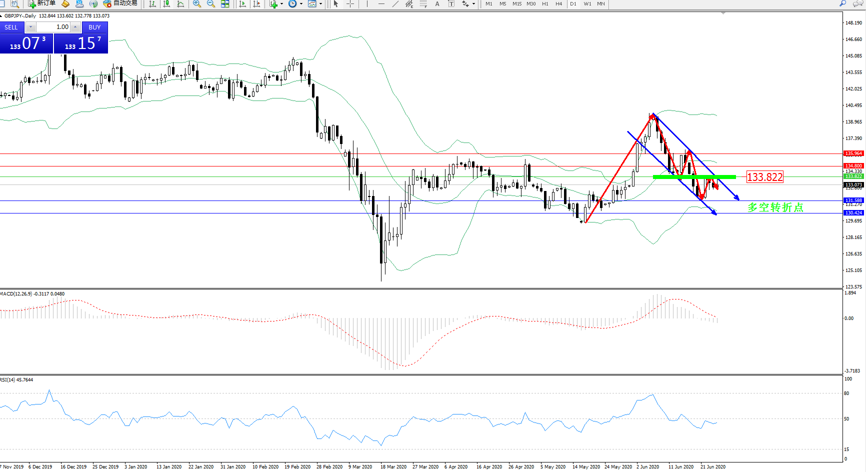 交易策略:133.822下方看跌,目标131.588130.424