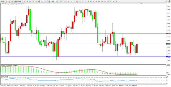 短期波幅空间逐渐收窄,市场整体处于窄幅波幅,上方压制关注1.21541附近,低位支撑关注1.19087附近,MACD指标处于空头区域维持整理,RSI指标处于50均衡线附近弱势徘徊,如图: